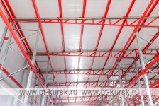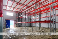 Быстровозводимый самонесущий склад на базе обычных фронтальных паллетных стеллажей. Устанавливается на сварных кровельных фермах. Имеет высоту 6 метров.